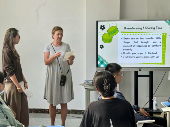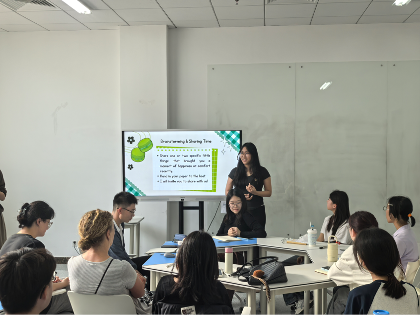 2025年10月9日14时30分,青岛大学公共外语教育学院与青岛大学英语服务志愿者协会(English Service Association of Qingdao University)在浮山校区西院慧创空间201室成功举办了第36期英语沙龙活动:“Small Moments of Happiness”。外籍教师Diane Thayer、公共外语教育学院张恬老师与英语爱好者参与了本次活动。